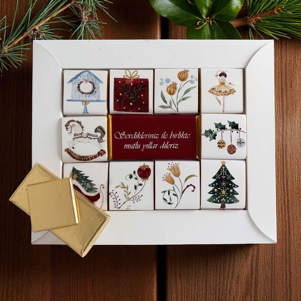 Tasarım, kutu ve çikolataları kaplayarak görsel bir şıklık sunar.